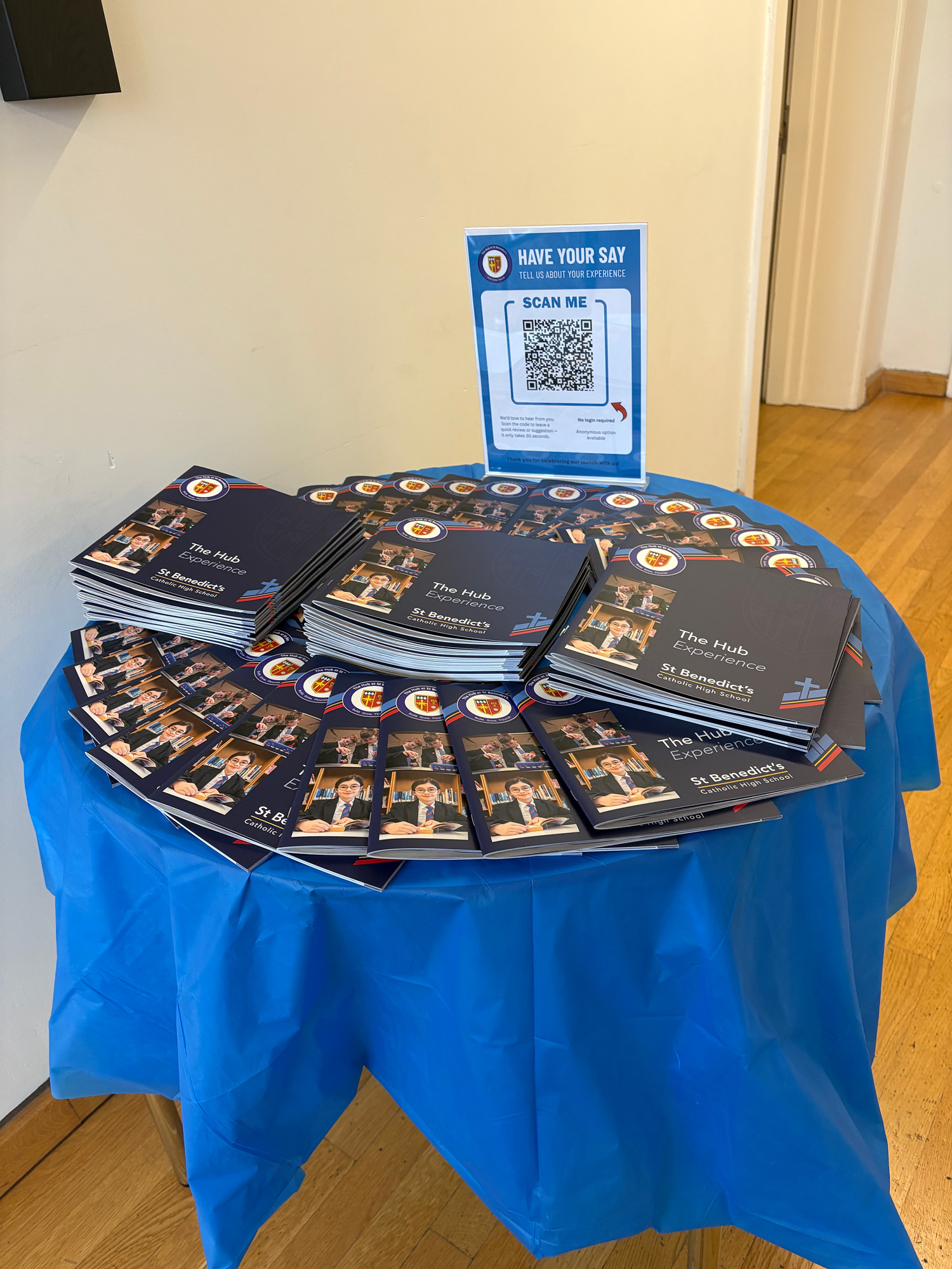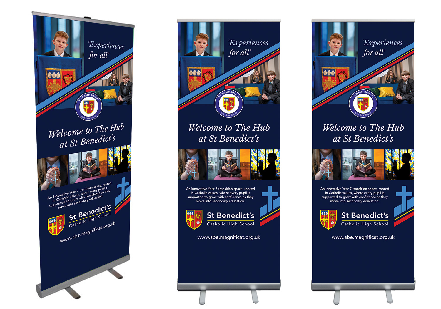 For St Benedict’s Catholic High School, the banners were designed to complement the prospectus brochure, using consistent branding, colours and messaging. This helped reinforce key themes throughout the evening and ensured a joined-up visual experience for prospective parents.